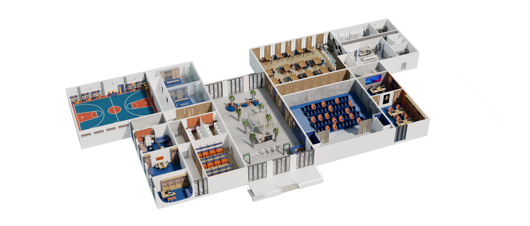 В спортивных залах, напротив, основное внимание уделяется безопасности и удобству использования. Здесь необходимо предусмотреть безопасный спортивный инвентарь, включая мячи, гимнастические маты, снаряды и тренажёры. Кроме того, особое значение имеет качественное напольное покрытие с амортизирующими свойствами, которое снижает риск травм и обеспечивает комфорт во время занятий физической культурой.