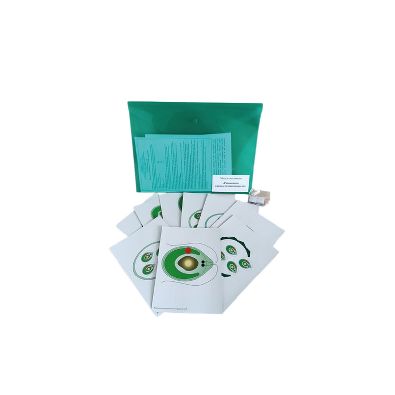 Пособие состоит из 9 карточек, напечатанных на картоне и ламинированных матовой (антибликовой) пленкой. На карточках изображены стадии цикла размножения одноклеточной водоросли на примере Хламидомонады. Пособие снабжено магнитным креплением, что позволяет монтировать схемы на магнитной доске. Перед началом работы с пособием, на карточки нужно наклеить магнитную резину, предварительно сняв с неё защитную плёнку. Модель-аппликация упакована в папку-конверт на кнопке.