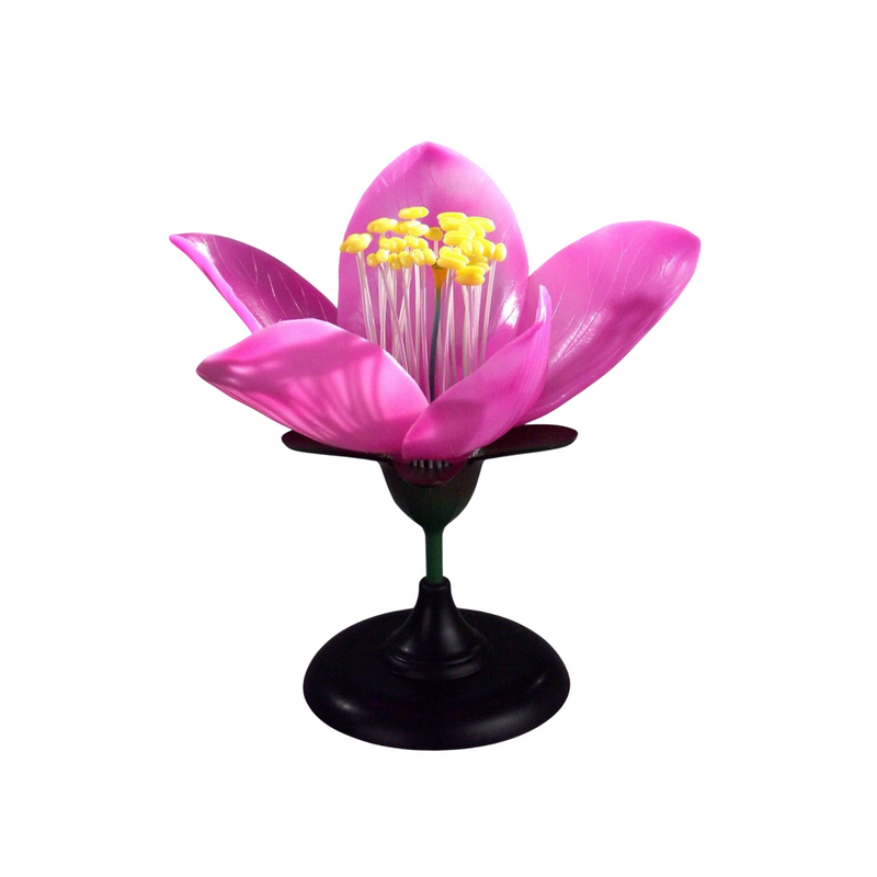 Модель цветная, изготовлена из пластмассы, представляет собой увеличенный цветок персика в разрезе. Модель разборная: чашелистики (4шт.), лепестки (3шт.), тычинки с целыми пыльниками (2шт.) и тычинки с поперечно разрезанными пыльниками (2 шт.), вставляются в пазы на цветоложе модели цветка. Модель позволяет рассмотреть особенности внешнего и внутреннего строения цветка яблони, а также внутреннее строение завязи пестика. На модели можно рассмотреть следующие детали строения: цветоложе, чашелистики, лепестки венчика, тычинки (тычиночные нити и пыльники), пестик (рыльце, столбик, завязь), пыльцевая трубка, семяпочка, семязачаток, яйцеклетка, центральная клетка.
