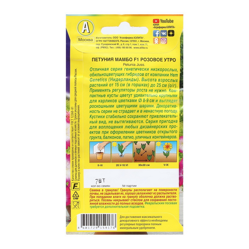 Семена в гранулах. Гранулы располагают на поверхности почвы, не заделывая их, хорошо увлажняют из распылителя. При попадании влаги на гранулу оболочка должна раствориться. Посевы накрывают стеклом для сохранения постоянной влажности до полных всходов. Февральским посевам требуется дополнительная подсветка.