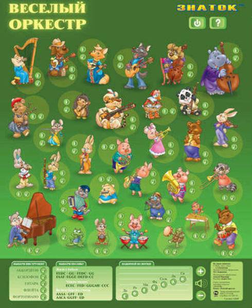 Электронный интерактивный плакат «Веселый оркестр» расскажет много интересного о разнообразных музыкальных инструментах и позволит услышать, как они звучат. Плакат может работать в четырех режимах: звуки, информация, экзамен, синтезатор звуков.