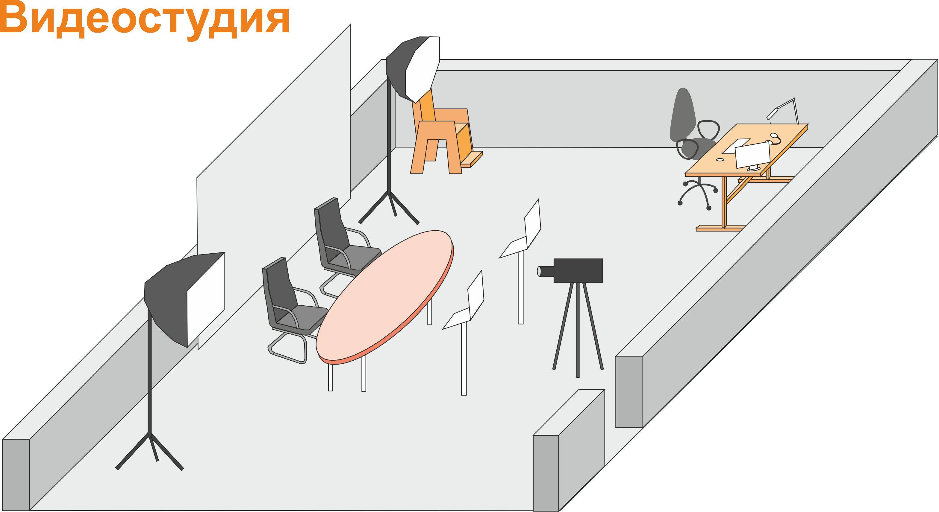 Состав видео- и фотостудии может быть любой комплектации по желанию заказчика с большим или меньшим количеством составляющих.