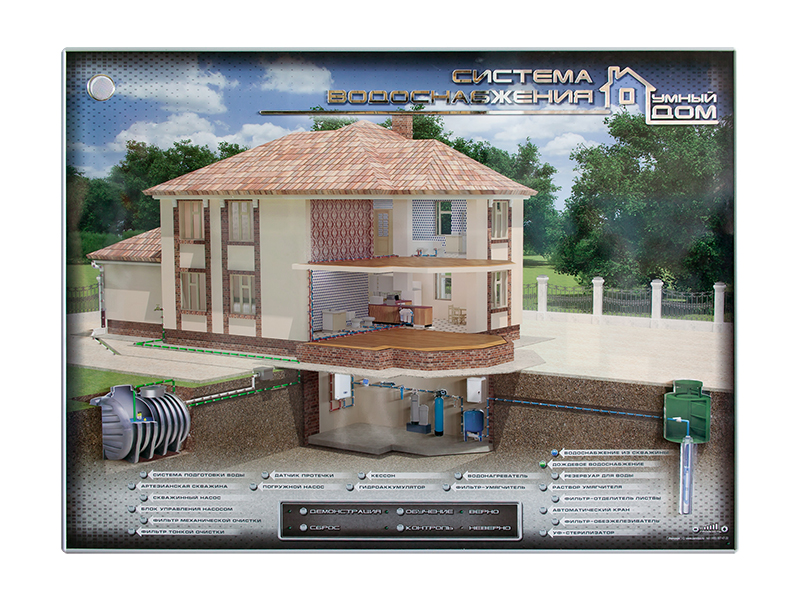 Стенд представляет собой светодинамическую панель с раздельной световой индикацией. На стенде представлена информация по практическому применению различных видов источников водоснабжения, демонстрирует наполнение резервуаров водой, полученной из атмосферных осадков при помощи насосной станции от скважины, водоемов и рек. В конструкцию учебного оборудования интегрированы высокочувствительные сенсоры для управления стендом при помощи интерактивного воздействия приемо-передающих устройств. Стенд снабжен функцией "Виртуальный учитель".