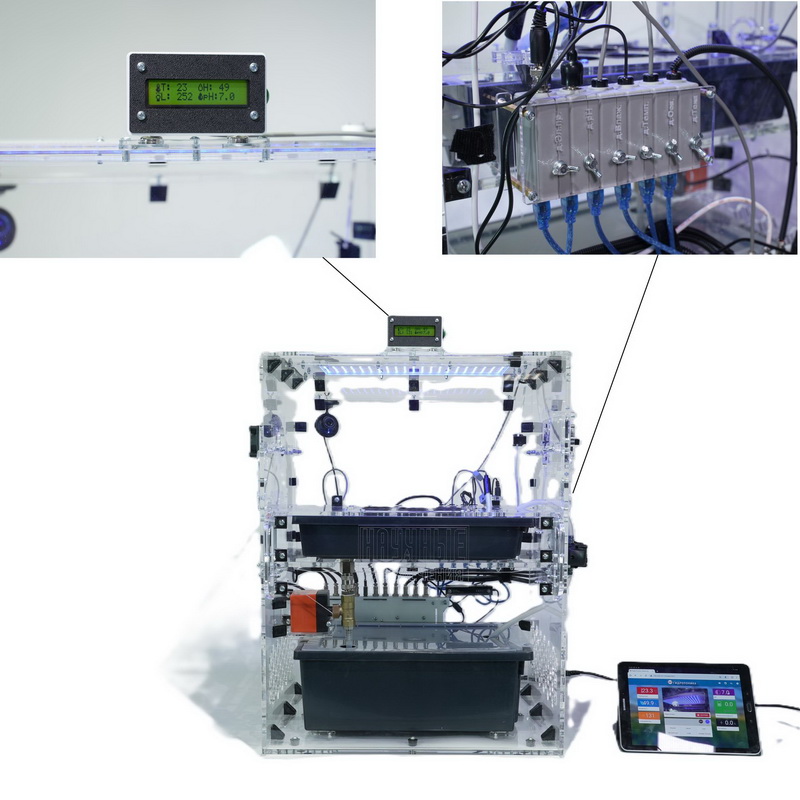 Управление всеми режимами работы и мониторинг за показаниями датчиков установки гидропонной осуществляются через локальный веб-интерфейс, который становится доступным при проводном или беспроводном подключении микрокомпьютера к локальной сети. Помимо возможности локального управления, система управления установки гидропонной имеет возможность передачи всех регистрируемых параметров в облачные сервисы по сетевым каналам.