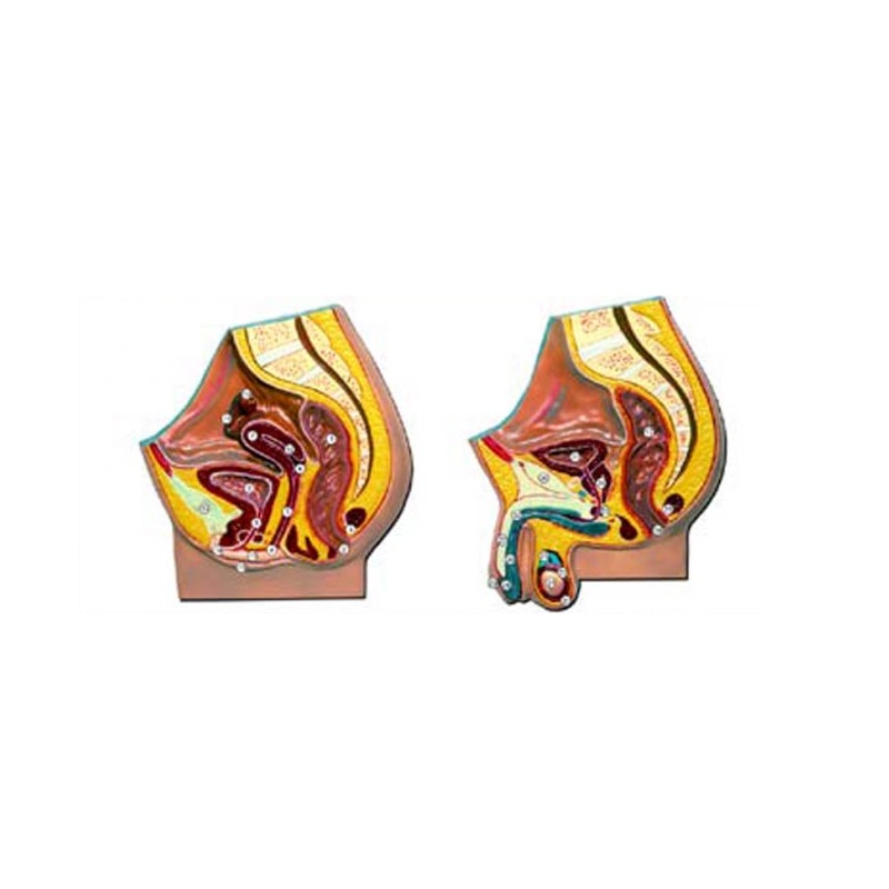Модель изготовлена из пластмассы путем вакуумного формования. Изображает сагиттальный разрез таза человека (мужчины и женщины), демонстрирует строение органов мочеполовой системы.