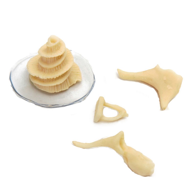 Комплект изготовлен из пластмассы. Представляет собой увеличенные слуховые косточки: молоточек, наковальня, стремечко и улитка. Улитка помещена в полупрозрачный пластмассовый чехол, который создает имитацию жидкости, в которой располагается улитка.