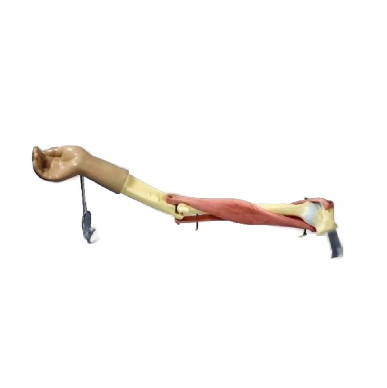 Модель изготовлена из пластмассы, мышцы из резины, устанавливается на подставку. Представляет собой локтевой сустав с кистью в натуральную величину, что позволяет рассмотреть его строение: кисть, локтевая кость, лучевая кость, плечевая кость, мышца - сгибатель (двуглавая мышца), мышца - разгибатель (трехглавая мышца).