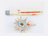 Модель нервной клетки состоит из 4 деталей: собственно тела нейрона с отростками, прозрачной ядерной оболочки и 2 шариков, имитирующих ядрышки. На ней можно рассмотреть особенности внешнего и внутреннего строения нейрона: ядро, ядрышки, пористую ядерную оболочку, секреторные образования, оболочку клетки, короткие ветвящиеся отростки с "шипиками" - дендриты, аксонный холмик - место отхождения длинного отростка нейрона (аксона).