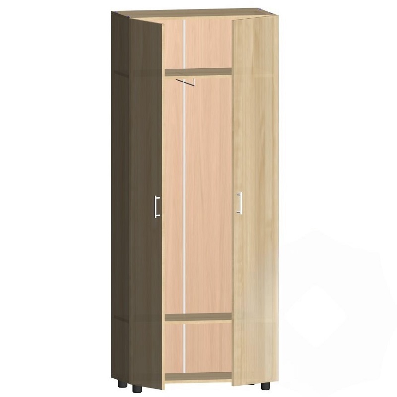 Шкаф для одежды снабжен регулируемыми опорами, выдвижной штангой и двумя крючками для одежды.