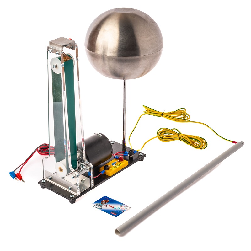 Генератор Ван-де-Граафа учебный предназначен для проведения демонстрационных опытов по электростатике, в том числе для демонстрации электризации тел и искрового газового разряда в воздухе. Кроме того, устройство позволяет показать перенос электростатического заряда движущейся диэлектрической лентой. Заряжаемая до высокого напряжения сфера выполнена съемной, что позволяет продемонстрировать устройство генератора Ван-де-Граафа и провести измерения эффективности переноса заряда движущейся лентой. Снятие заряда с ленты и зарядка ее поверхности обеспечиваются щетками верхнего и нижнего роликов соответственно. Питание электродвигателя привода ленты осуществляется от регулируемого источника постоянного тока (в комплект не входит).