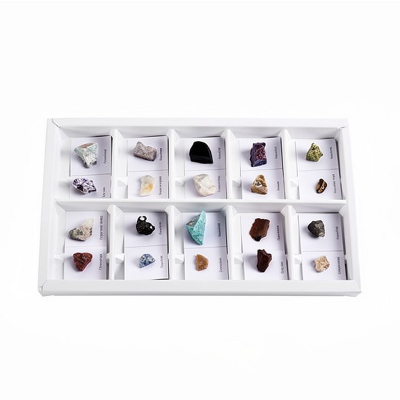 Коллекция предназначена для демонстрации на уроках географии. Образцы наклеены на картонные карточки и подписаны, упакованы в коробку с ячейками. Пособие комплектуется руководством по эксплуатации.