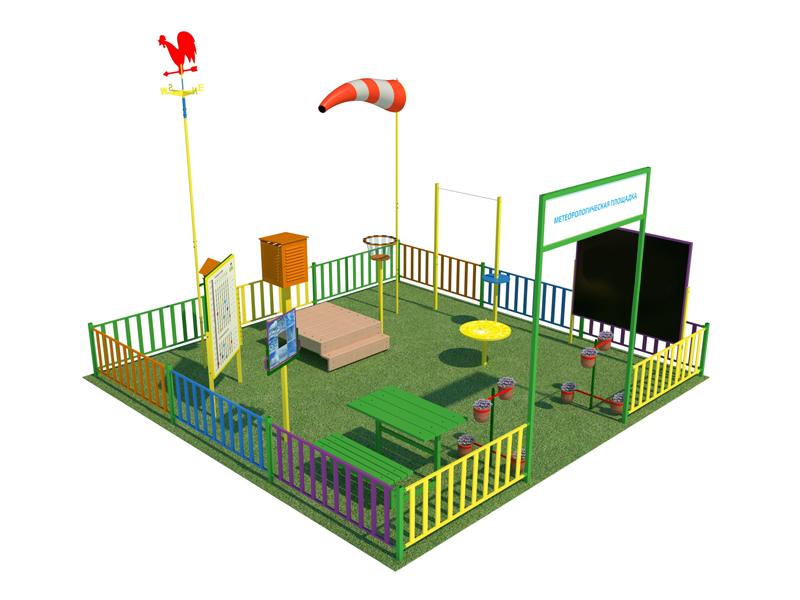 Детская метеоплощадка предназначена для отслеживания детьми погоды в течение всех сезонов. На ней расположены приборы, аналогичные тем, что используют профессиональные метеослужбы, с помощью которых дети смогут измерять давление, температуру и влажность воздуха, уровень осадков. Метеоплощадка сертифицирована, безопасна, экологична.
