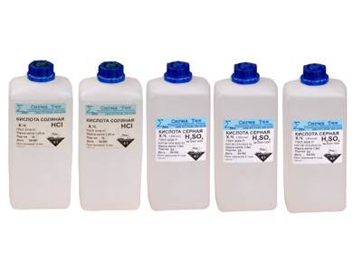 Состав набора (кг.): Соляная кислота - 2,4. Серная кислота - 4,5.
