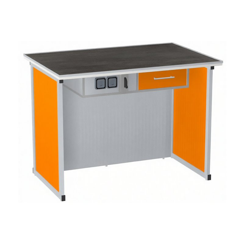 Стол демонстрационный, предназначен для демонстрации опытов по химии. Основание стола усиленный металлический сборно разборный каркас из трубу сечением 30х30х2 мм, столешница покрыта химически стойкой керамической плиткой, по контору столешницы противопроливочный бортик из шлифованной нержавеющей стали, задняя стенка лабораторного стола металлическая толщиной 1 мм. На передней части панели стола демонстрационного расположен электрический блок розеток 220 вольт, автомат аварийного отключения и выдвижной ящик.