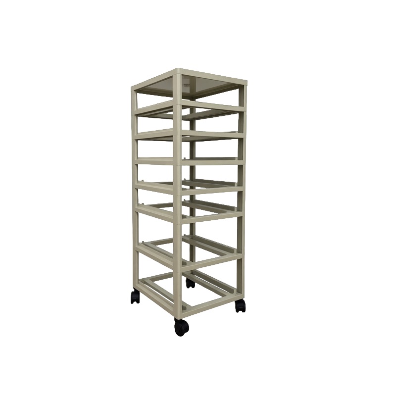 Мобильная стойка для лотков. Выполнена в форме полочного стеллажа из ударопрочного пластика. Конструкция стеллажа подходит для лотков, в которых хранится оборудование для сдачи экзаменов по химии в форме ОГЭ (наборы ГИА-лаборатории). Имеет колёсную опору.