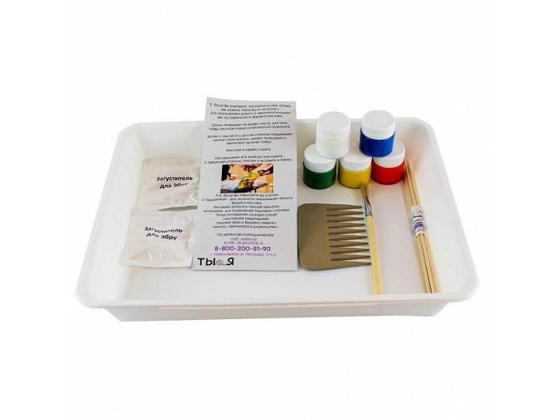– загуститель; краски (5 штук); кисть; гребень пластиковый; перо из дерева (5 штук); бумага; подробная инструкция;