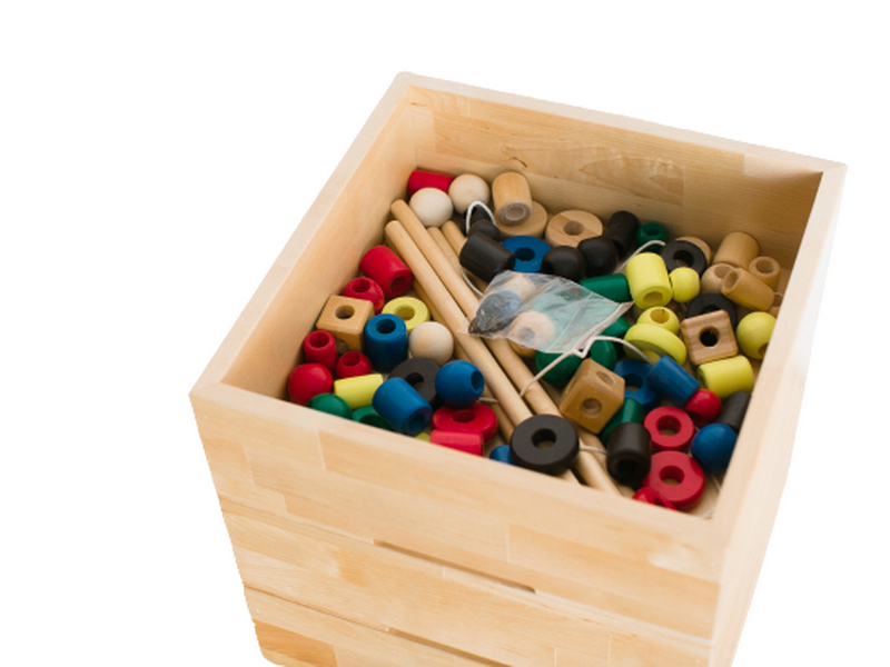Набор состоит из множества фигур среднего размера. Часть из них окрашена в яркие цвета, вторая - нет. В каждой фигурке есть отверстие, что позволяет нанизывать их на веревочку или деревянный стержень. Задача ребенка: нанизать бусины в заданном порядке, отсортировать из по определенному признаку: цвету или форме. Игры с этим набором стимулируют логическое мышление, улучшают моторику и координацию движений рук. Ребенок получает представление о цвете, геометрических формах, учится счету.