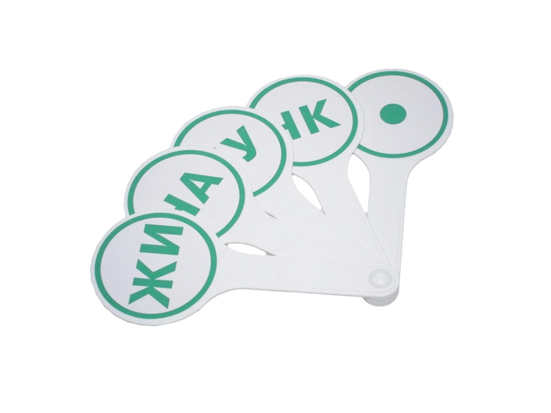 Представляет собой комплект пластинок со слогами и буквосочетаниями. Слоги выполнены крупным шрифтом и нанесены яркой краской. Пластинки скреплены аналогично соединению деталей веера.
