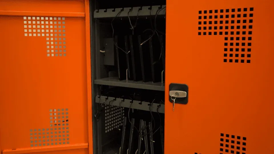 Тележка (сейф) для хранения и зарядки 18 ноутбуков окрашена порошковой краской серого цвета.