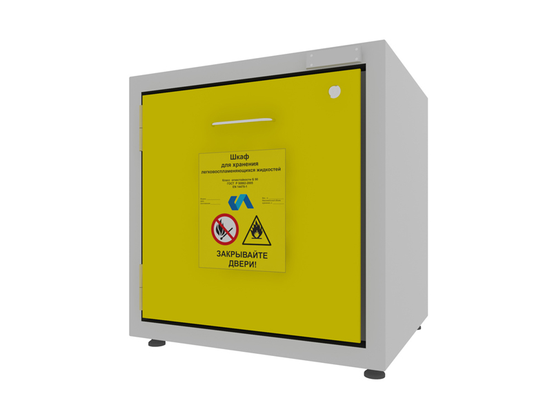 Шкаф для хранения ЛВЖ обладает монолитной цельносварной конструкцией. Новая техника изготовления с двойной оболочкой, состоящей из двух корпусов, внутреннего и наружного. Новая огнеупорная изоляция, выполненная из экологически безопасного материала, характеризующегося высочайшей огнеупорностью. Внутренний корпус с панелями из не царапающегося материала, устойчивого к действию коррозийных веществ. Терморасширяющаяся прокладка 7 + 4 см, увеличивающаяся в объеме в случае пожара, полностью изолируя внутреннюю часть шкафа от внешней среды. Дополнительная терморасширяющаяся прокладка для защиты от пыли с защитой от “холодных и горячих дымов”. Распашные дверки, поддон для хранения из окрашенной эпоксидной порошковой краской электрооцинкованной стали, с противокислотной защитой, с решеткой, выполняющей роль полки. Объем сбора около 5 литров, грузоподъемность полки кг 80.