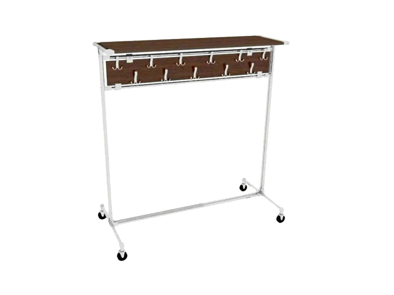 Вешалка напольная передвижная с крючками для гардероба. Изготавливается из сварной стальной хромированной трубы и ЛДСП-панели. Крючки металлические крепятся межсекционными стяжками на винты (не саморез), удерживая друг друга.