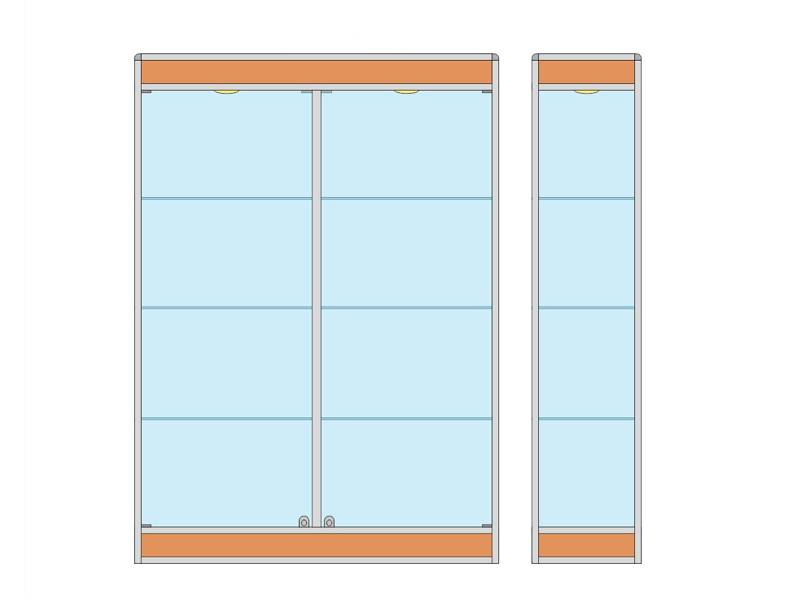 Каркас из витринного алюминиевого профиля. Стенки и 3 полки стеклянные. Имеются 2 распашные дверки с замком и ключом. Два светильника.