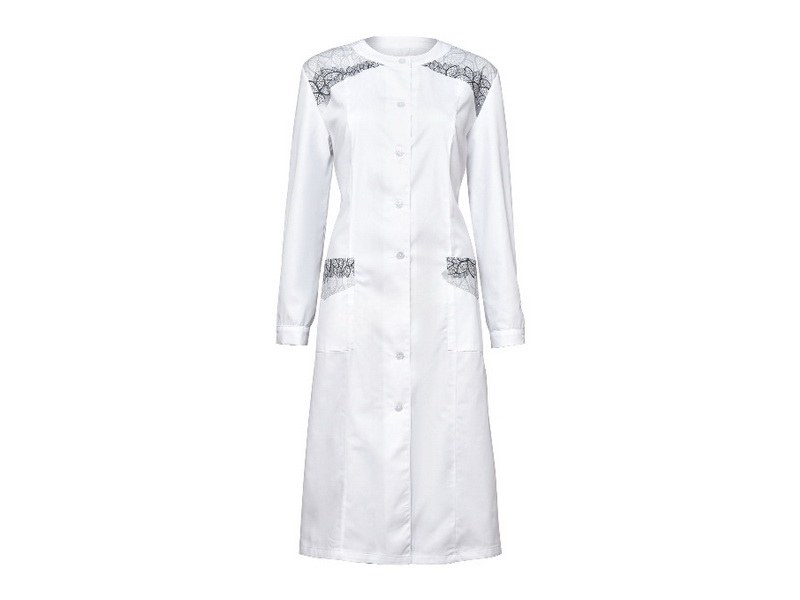 Элегантная модель медицинского халата с отделкой кружевом. Удобный и красиво украшенный рукав 3/4. Имеет кружевные вставки чуть ниже линии плеча, классическую застёжку на пуговицы, два накладных кармана декорированные кружевом.
