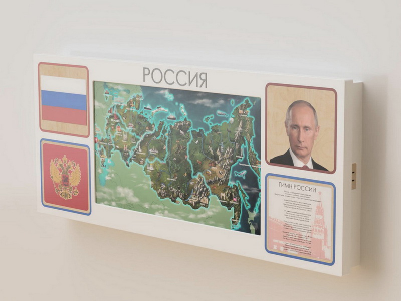 Настенная интерактивная панель с сенсорным монитором, декорированная основной символикой РФ: герб, флаг, гимн, портрет президента. Разработана для реализации программы патриотического воспитания в школе, детском саду или других образовательных учреждениях. Подходит для оформления входной зоны и классов. Соответствует требованиям ФГОС 3.