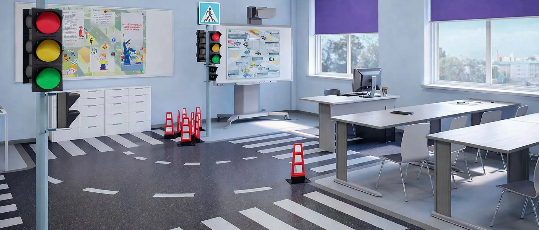 В комплект поставки входит набор цветных маркеров для нанесения записей на доску и комплект тематических магнитов "Безопасный маршрут школьника" в виде транспортных средств, дорожных знаков, дорожной разметки, пешеходов и велосипедистов для моделирования различных дорожных ситуаций.