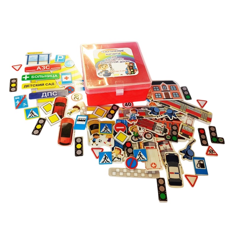 В комплекте 60 тематических магнитов (здания, пешеходы, транспорт, спецтранспорт, дорожные знаки, светофоры, искуственная неровность, зебра). Всё для проведения занятий по изучению ПДД в игровой форме. С магнитами вы сможете легко разобрать все самые известные дорожные ситуации, а также создать свои ситуации требующие внимания.
