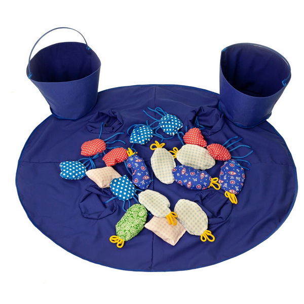 Комплектация: тканевый пруд с 4 прорезями для рук, рыбки и осьминожки (по 4 штуки с 2 наполнителями) всего по 8 штук, 2 ведра для сбора улова, наполнитель в тканевых мешочках (2 штуки), мешок для хранения игры.
