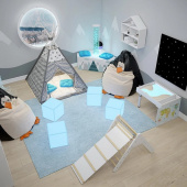 Такая сенсорная комната - идеальное решение для детских садов, групп и других образовательных учреждений. Она может быть компактно установлена на небольшой площади и и легко интегрирована в существующие помещения. Мы предлагаем полный комплект сенсорных устройств, включая специальные настенные панели, мягкие полы и сиденья, а также управляющую систему, которая позволяет настраивать и контролировать воздействия в комнате.