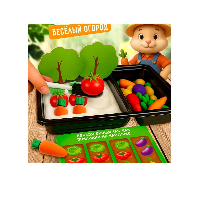 Познакомьте малыша с фигурками овощей: назовите их, проговорите цвета, полезные свойства и места прорастания. Вместе с ребёнком посадите огород, добавьте фигурки животных, сделайте забор из прищепок. А когда урожай взойдёт, соберите фрукты и овощи лопаткой! Выполняйте задания вместе с ребёнком, обучите его счёту и познакомьте с основными цветами.