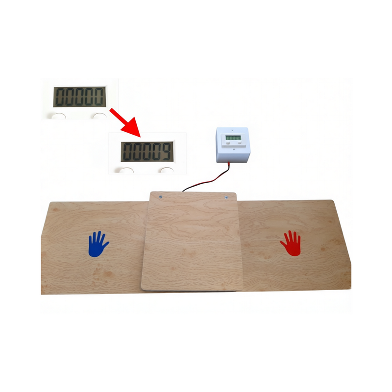 При касании грудью контактной платформы, расположенной по центру происходит срабатывание датчика и число на дисплее увеличивается на 1. Таким образом осуществляется контроль полного сгибания рук при отжимании. Разгибание рук контролируется судьей визуально.