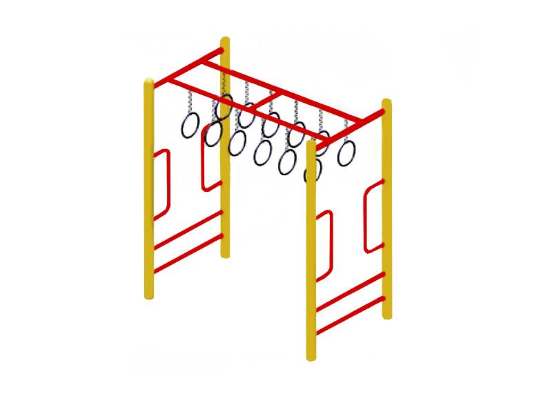 Рукоход изготавливается из металлической трубы, окрашенной полимерно-порошковой краской, устойчивой к воздействию неблагоприятных погодных условий и ультрафиолета. Кольца и цепь металл.
