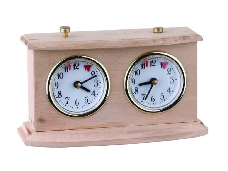 Часы Рубин в подарочном деревянном корпусе с подставкой для устойчивости внизу и деревянным карнизом вверху.