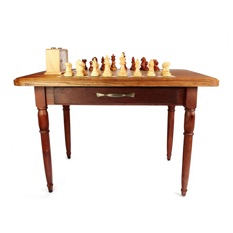 Шахматный стол "Маэстро". Столешница выполнена из ламината под натуральное дерево, шахматная доска - шпон из дуба, вишни с лаковым покрытием в 3 слоя. Подстолье с ящиком и ножки из натурального дерева. Выдвижной деревянный ящик имеет два отделения, в одно из которых вмещается комплект шахматы Стаунтон №6.
